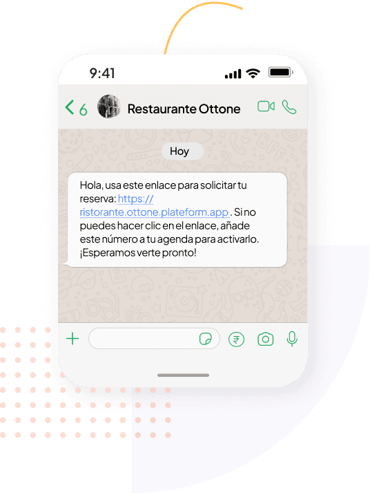 Facilita las reservas para tus clientes. Con la centralita Rescall, envías un mensaje automático de WhatsApp con el enlace de reserva, haciendo que reservar una mesa en tu local sea sencillo e inmediato, sin tener que llamar.