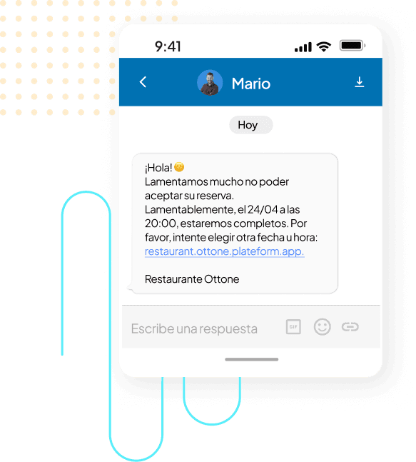 Puedes enviar mensajes ilimitados por WhatsApp para comunicarte sobre reservas y pedidos: desde la confirmación de la reserva, mesa lista, hasta los recordatorios. Aprovecha uno de los canales más utilizados del mundo, ¡sin preocuparte más por recargas!