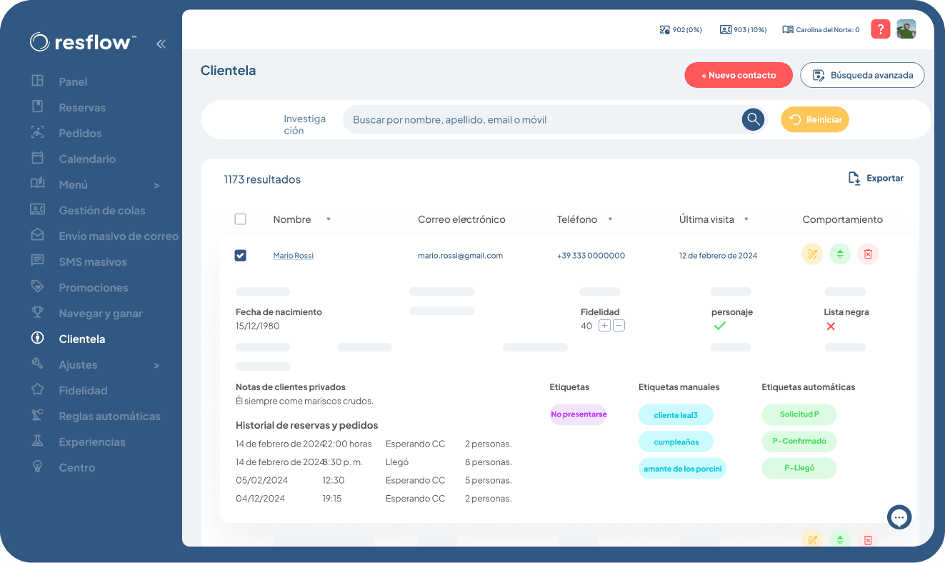 Con Resflow, construyes un archivo detallado de tus clientes para tener siempre a un clic la información más importante. Personaliza aún más con los "tags" para una gestión a medida.