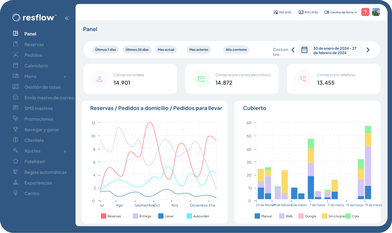 El Panel de Resflow te ofrece un control total sobre los datos y el rendimiento de tu restaurante, todo en un solo vistazo, en una única pantalla.
