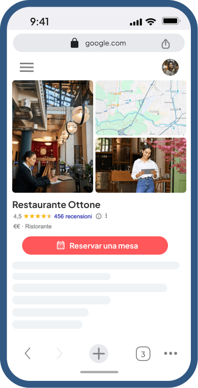 Il bottone “Prenota” sulla tua scheda Google MyBusiness ti dà massima visibilità su Google e Google Maps. Più occhi sul tuo ristorante, più prenotazioni!