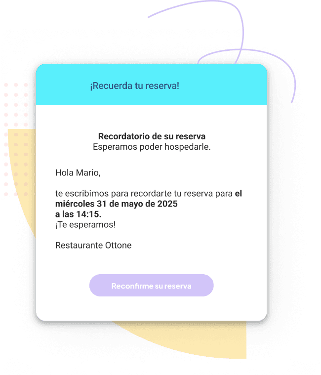 Puedes enviar mensajes ilimitados por WhatsApp para comunicarte sobre reservas y pedidos: desde la confirmación de la reserva, mesa lista, hasta los recordatorios. Aprovecha uno de los canales más utilizados del mundo, ¡sin preocuparte más por recargas!