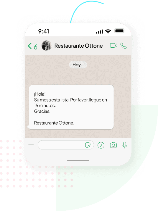 Puedes enviar mensajes ilimitados por WhatsApp para comunicarte sobre reservas y pedidos: desde la confirmación de la reserva, mesa lista, hasta los recordatorios. Aprovecha uno de los canales más utilizados del mundo, ¡sin preocuparte más por recargas!