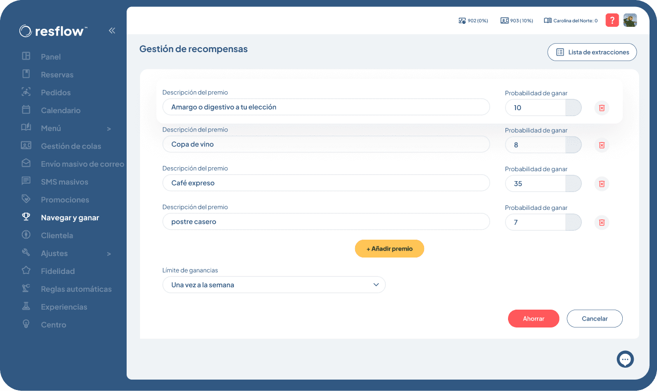 Haz felices a tus clientes con premios que los hacen sentir especiales. Con Resflow, quien gana un premio tiene más posibilidades de volver a tu local, aumentando la fidelidad y satisfacción de tu clientela.