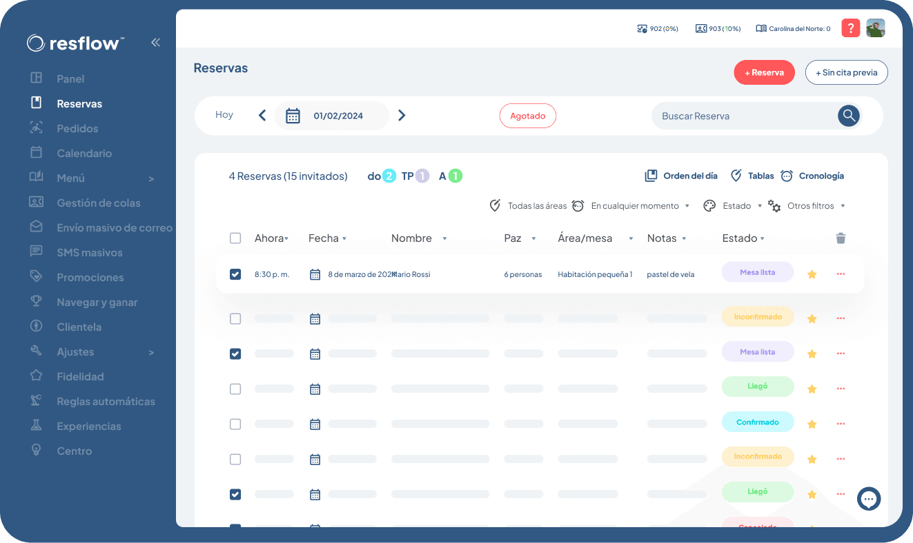 Gestiona cualquier tipo de reserva con facilidad: desde las telefónicas a las online, de Google y los clientes de paso (walk-in). Con Resflow, simplificas la gestión de reservas con pocos clics y de forma intuitiva e inmediata.